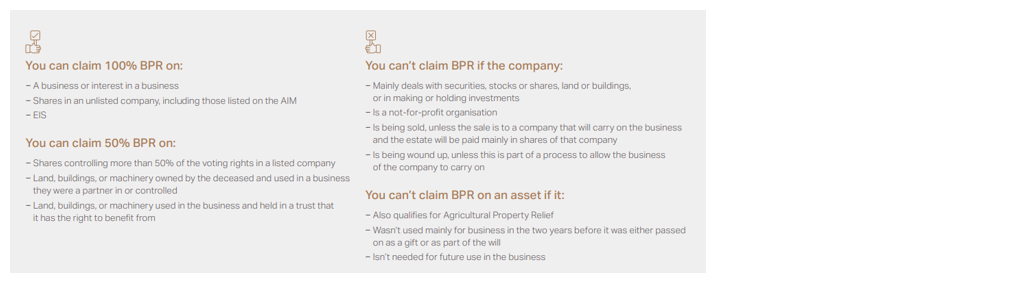 You can claim 100% BPR on: - A business or interest in a business - Shares in an unlisted company, including those listed on the AIM - EIS